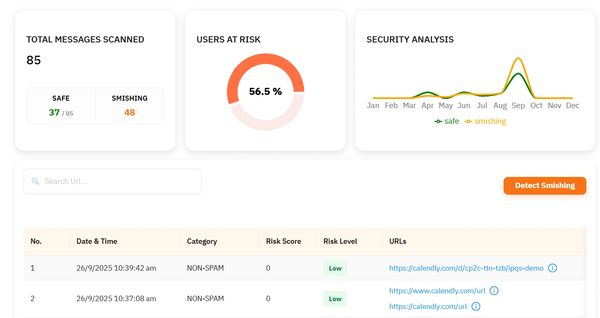 Smishing Analytics delivers unified, real-time insights into phishing attacks across all users—combining aggregated risk scores, URL intelligence, user-specific risk indicators, and monthly trend analysis to enable proactive scam detection and response.
