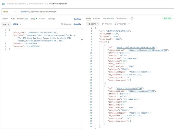 Sample API request and response showcasing insights not only for the visible link in the message, but also for any hidden or obfuscated links detected beneath the surface.